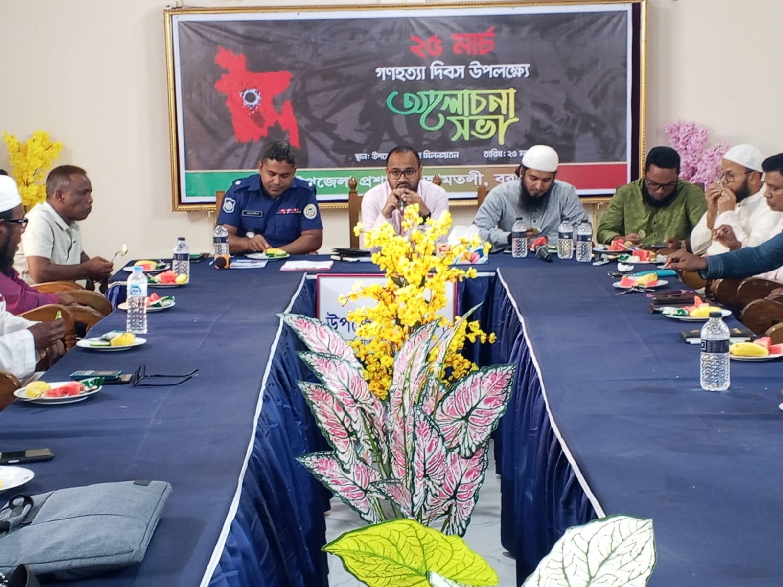 আমতলী(বরগুনা) প্রতিনিধি : বরগুনার আমতলী উপজেলা প্রশাসনের উদ্যোগে গন হত্যা দিবস পালিত হয়েছে । দিবসটি পালন উপলক্ষে বুধবার বেলা ১১ টায় আমতলী উপজেলা পরিষদ মিলনায়তনে আলোচনা সভা অনুষ্ঠিত হয়েছে । আমতলী উপজেলা নির্বাহী অফিসার মুহাম্মদ আশরাফুল ইসলামের সভাপতিত্বে অনুষ্ঠিত আলোচনা সভায় বক্তব্য রাখেন সহকারী কমিশনার (ভূমি) মো: আশরাফুল ইসলাম, আমতলী থানার ভারপ্রাপ্ত কর্ম কর্তা মো: জাহাঙ্গির হোসেন , সমাজসেবা অফিসার মানজুরুল হক কাওসার , প্রাথমিক শিক্ষা অফিসার মো: সফিউল আলম, আমতলী প্রেসক্লাবের সভাপতি মো: রেজাউল করিম, বকুল নেছা মহিলা কলেজের প্রভাষক মো: জয়নুল আবেদিন, চুনা খালী সরকারী প্রাথমিক বিদ্যালয়ের প্রধান শিক্ষক মো: আনোয়ারুল কবির (প্রমুখ)